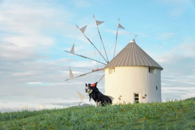 芝生のグリーンと風車の白が織りなすコントラストに、魔女の姿をした主役の存在が際立ちます。旅のワンシーンが映画のように切り取られ、特別な物語を感じさせます。