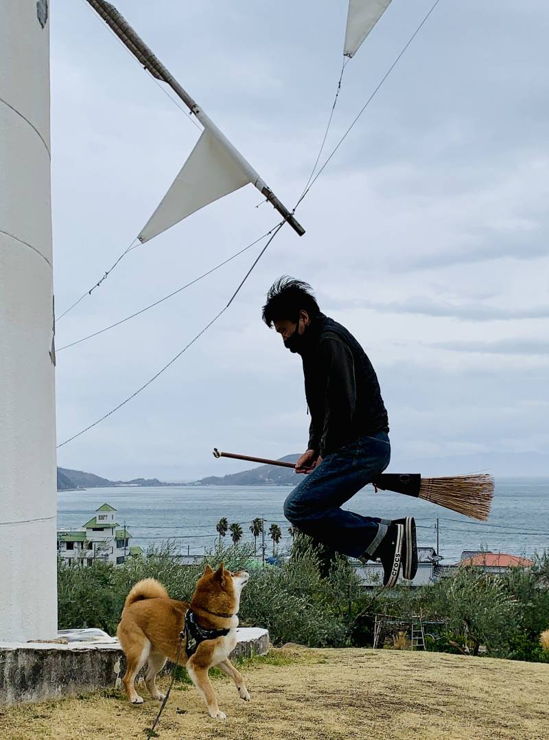 パパのほうきジャンプを応援!小豆島の旅は、人もペットも一緒に楽しめることを伝えた、元気いっぱいの一枚ですね。
