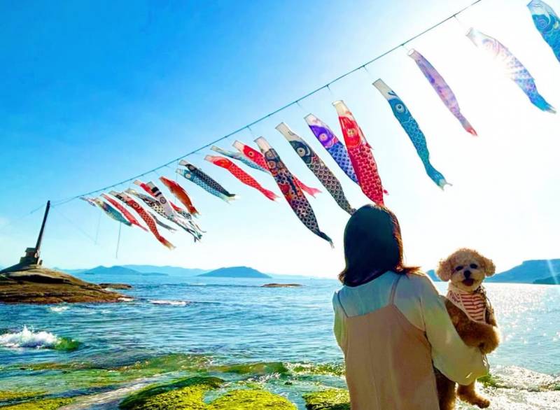 キラキラの海と空を泳ぐこいのぼり。飼い主さんの抱っこに安心しながら、初夏の小豆島を楽しんでいる様子が伝わってきます。
