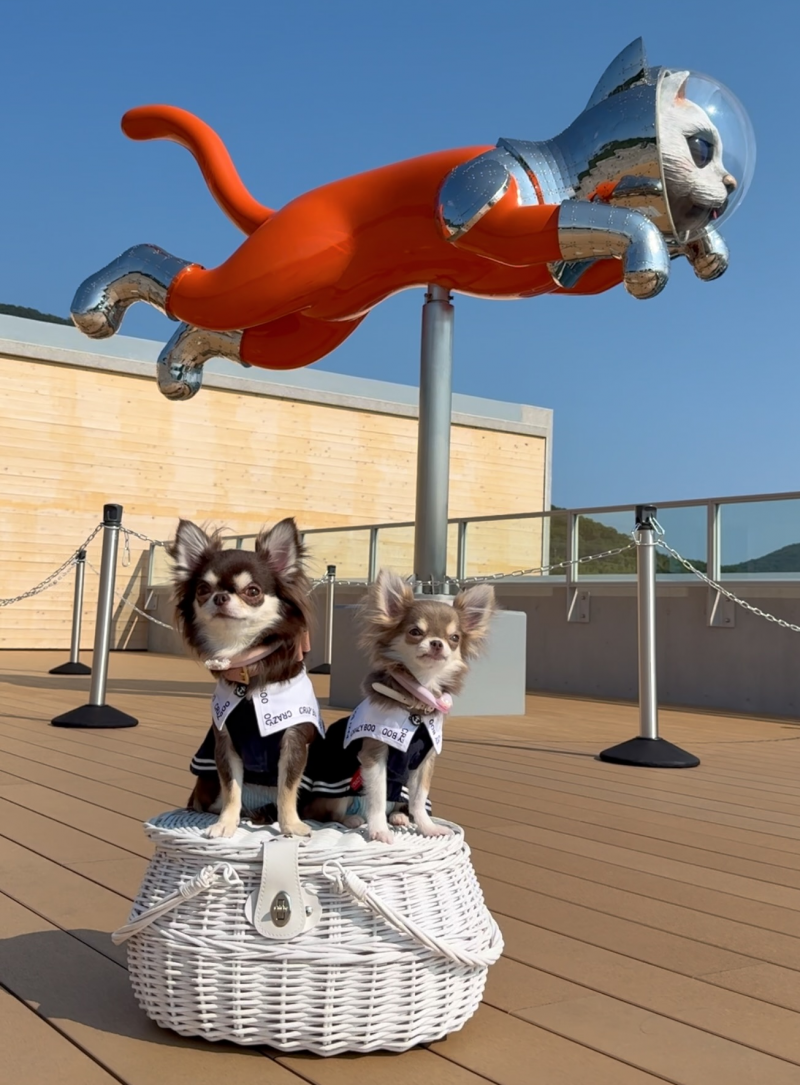 現代アート作品の前にちょこんと座るワンちゃんたち♪ “SHIP’S CAT”の仲間みたいで、とってもキュートな一枚ですね。