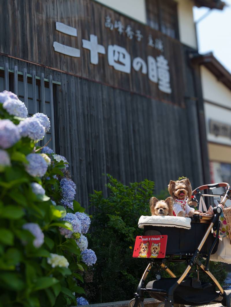 永遠の名作を鑑賞しに来た2匹の仲良しワンちゃん。レトロな雰囲気を彩る紫陽花のコントラストが素敵です。この日は紫陽花の時期とは思えないほど暑い日だったそう。暑い中小豆島に遊びに来てくれたことに感謝ですね。