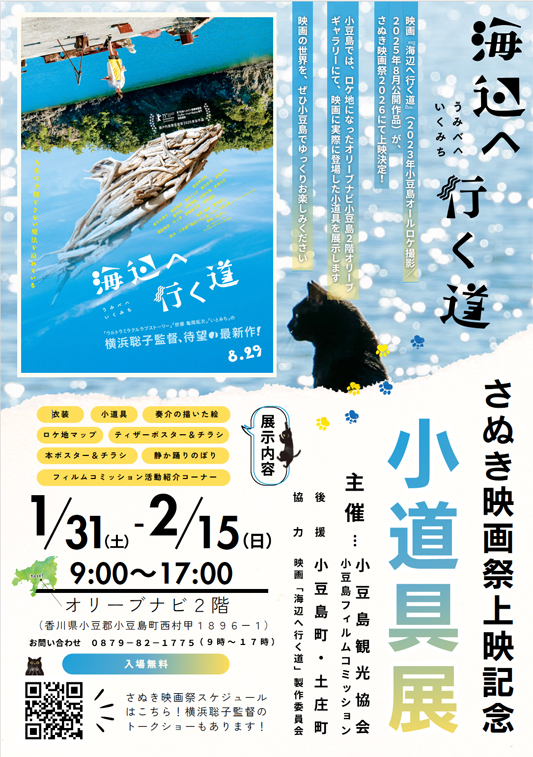 2025年8月に公開された、横浜聡子監督の小豆島オールロケ作品「海辺へ行く道」の小道具展を、さぬき映画祭2026での作品上映を記念し、撮影の地・小豆島で開催します!