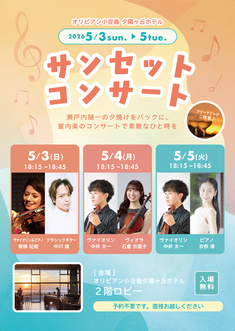 ゴールデンウィークの5月3・4・5日の3日間、オリビアン小豆島夕陽ヶ丘ホテルにて、クラシックの無料コンサートが開催されます。